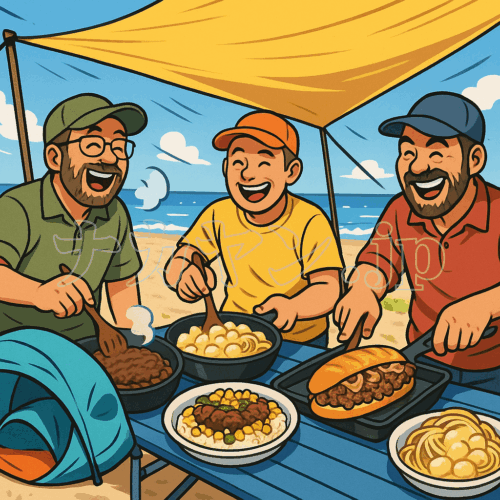 朝の海風と、オヤジ達のわんぱく料理ショー