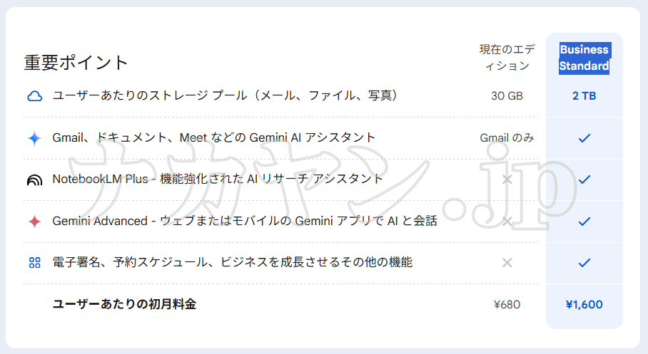 | サービス | 1名追加 | Google Workspace Business Starter |